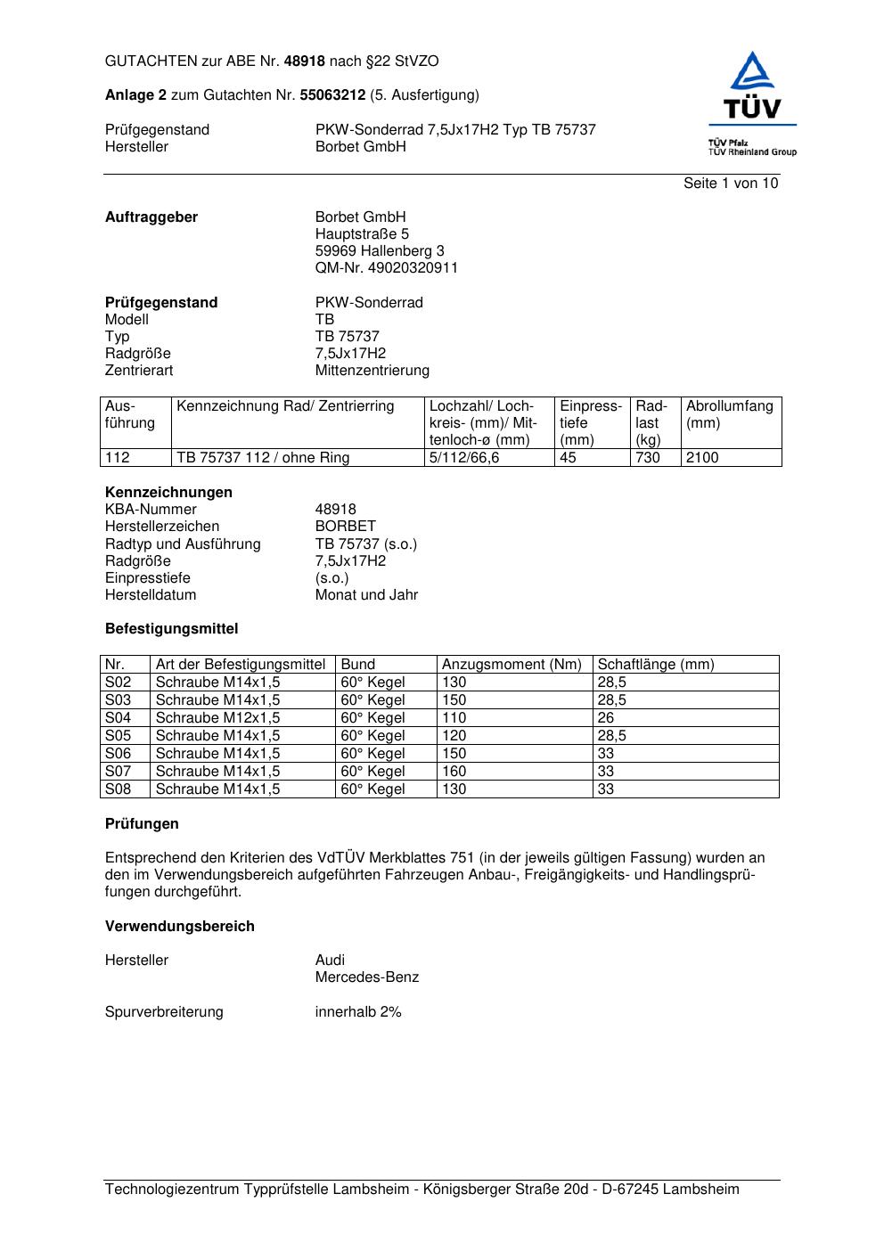 Dieses Gutachten (abe) bezieht sich auf die Alufelge Borbet TB 75737 in der Ausführung 7.5Jx17 ET 0, Mittenloch 0 mm (KBA 48918). Im PDF findest du typischerweise zulässige Reifengrößen, Auflagen/Anbauhinweise und – je nach Dokument – Hinweise zur Eintragung.