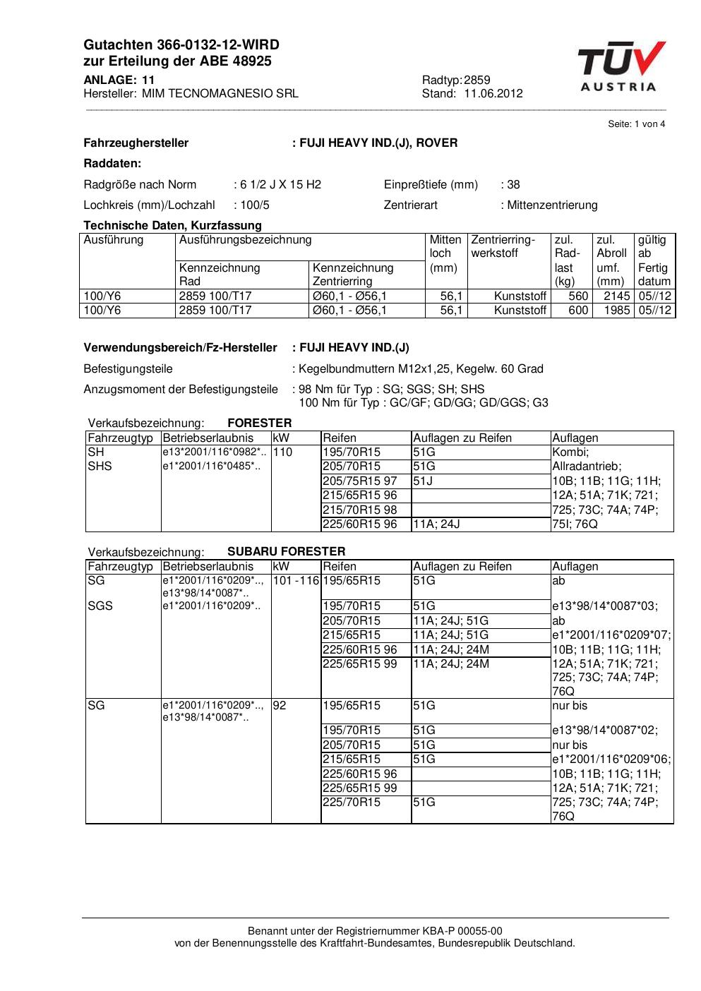 Dieses Gutachten (abe) bezieht sich auf die Alufelge ATS 2859 in der Ausführung 2Jx15 ET 0, Mittenloch 0 mm (KBA 48925). Im PDF findest du typischerweise zulässige Reifengrößen, Auflagen/Anbauhinweise und – je nach Dokument – Hinweise zur Eintragung.