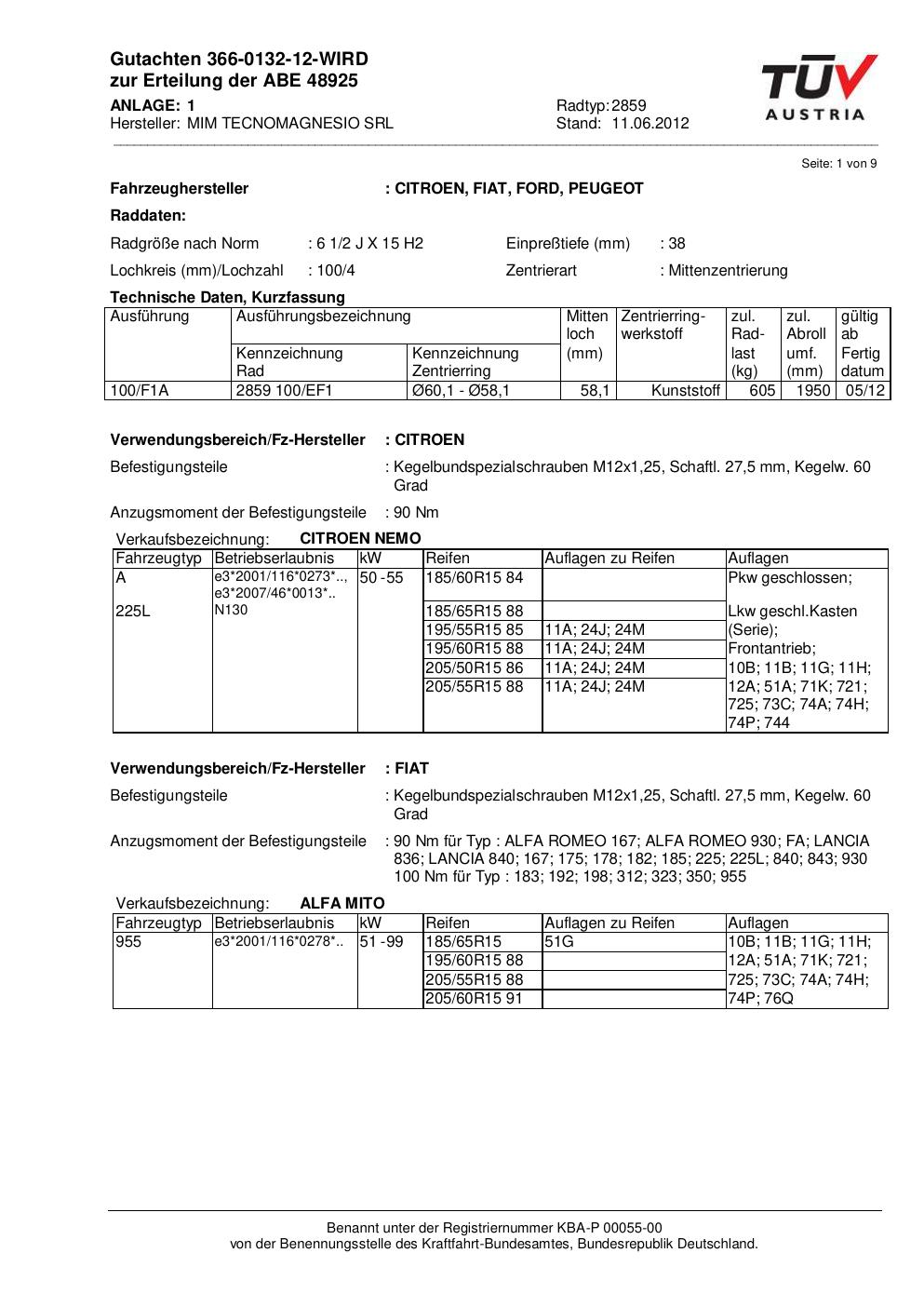 Dieses Gutachten (abe) bezieht sich auf die Alufelge ATS 2859 in der Ausführung 2Jx15 ET 0, Mittenloch 0 mm (KBA 48925). Im PDF findest du typischerweise zulässige Reifengrößen, Auflagen/Anbauhinweise und – je nach Dokument – Hinweise zur Eintragung.