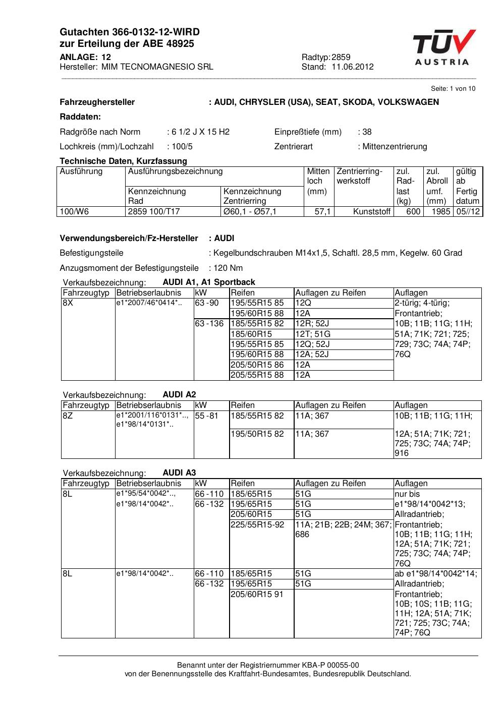 Felgengutachten / abe für Alufelgen ATS 2859 (2Jx15 ET 0, Mittenloch 0 mm) mit KBA 48925 (Zertifikatsnummer 48925). Hier kostenlos als PDF herunterladen. Der Download-Link ist 24 Stunden gültig und kann bis zu zwei Mal verwendet werden.