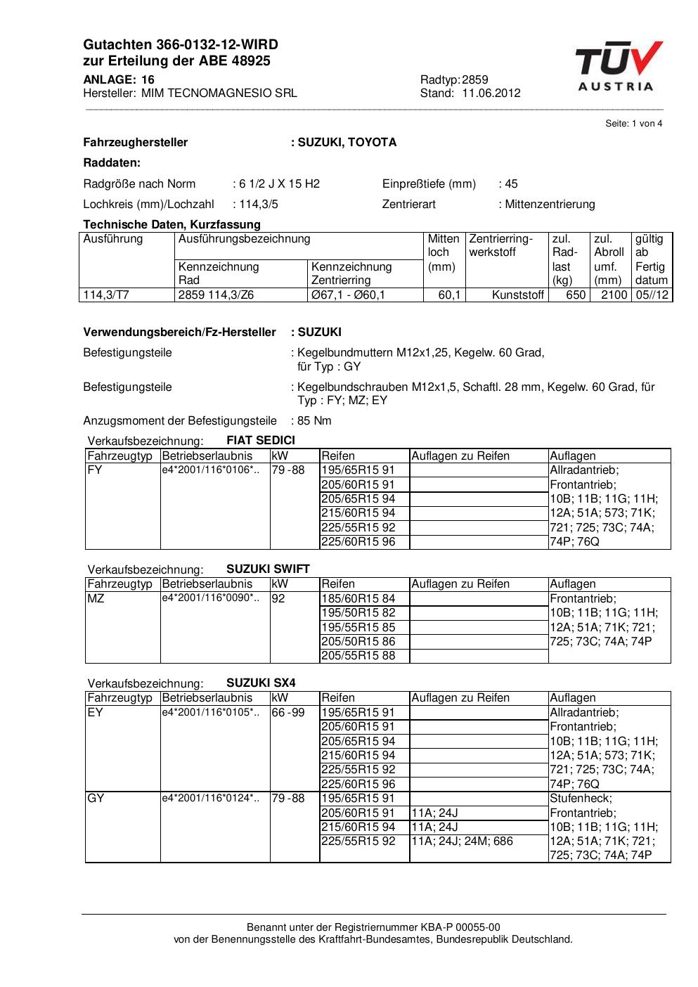 Dieses Gutachten (abe) bezieht sich auf die Alufelge ATS 2859 in der Ausführung 2Jx15 ET 0, Mittenloch 0 mm (KBA 48925). Im PDF findest du typischerweise zulässige Reifengrößen, Auflagen/Anbauhinweise und – je nach Dokument – Hinweise zur Eintragung.