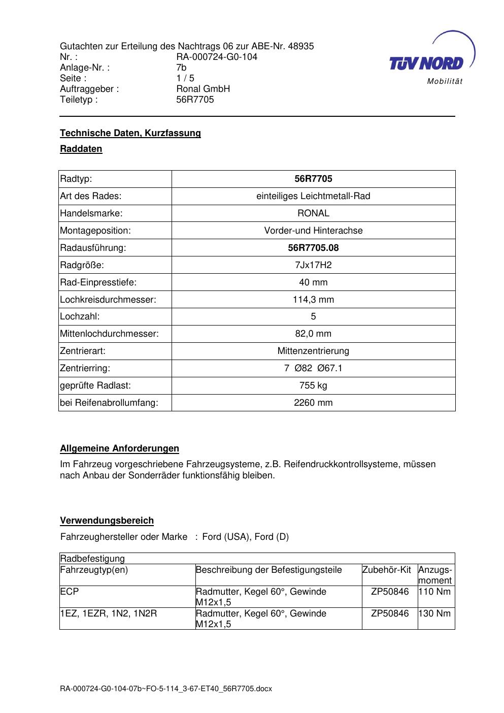 Dieses Gutachten (abe) bezieht sich auf die Alufelge Ronal 56R7705 in der Ausführung 7Jx17 ET 0, Mittenloch 0 mm (KBA 48935). Im PDF findest du typischerweise zulässige Reifengrößen, Auflagen/Anbauhinweise und – je nach Dokument – Hinweise zur Eintragung.