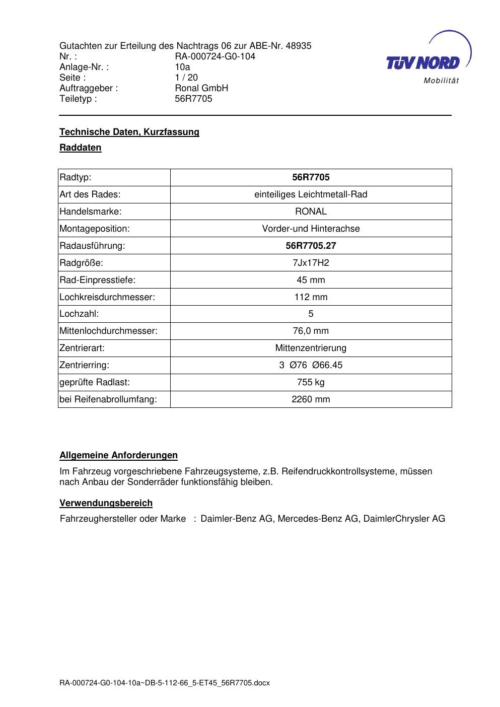 Dieses Gutachten (abe) bezieht sich auf die Alufelge Ronal 56R7705 in der Ausführung 7Jx17 ET 0, Mittenloch 0 mm (KBA 48935). Im PDF findest du typischerweise zulässige Reifengrößen, Auflagen/Anbauhinweise und – je nach Dokument – Hinweise zur Eintragung.