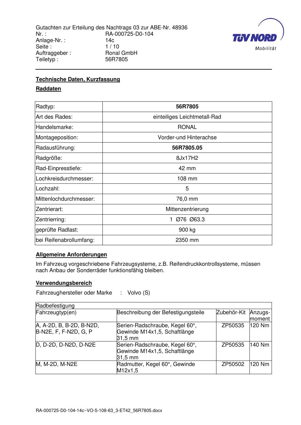 Dieses Gutachten (abe) bezieht sich auf die Alufelge Ronal 56R7805 in der Ausführung 8Jx17 ET 0, Mittenloch 0 mm (KBA 48936). Im PDF findest du typischerweise zulässige Reifengrößen, Auflagen/Anbauhinweise und – je nach Dokument – Hinweise zur Eintragung.