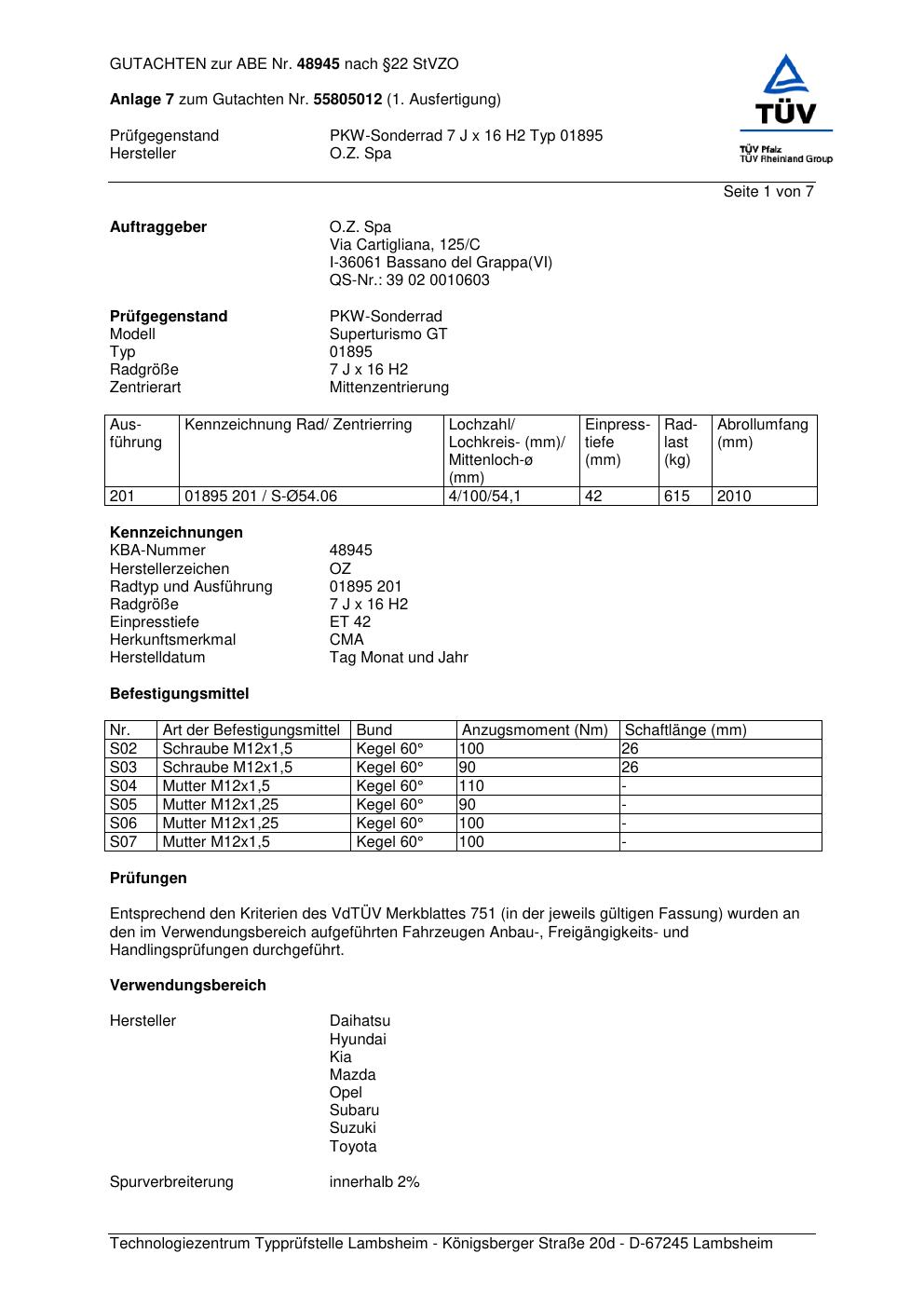 Dieses Gutachten (abe) bezieht sich auf die Alufelge ATS 01895 in der Ausführung 7Jx16 ET 0, Mittenloch 0 mm (KBA 48945). Im PDF findest du typischerweise zulässige Reifengrößen, Auflagen/Anbauhinweise und – je nach Dokument – Hinweise zur Eintragung.