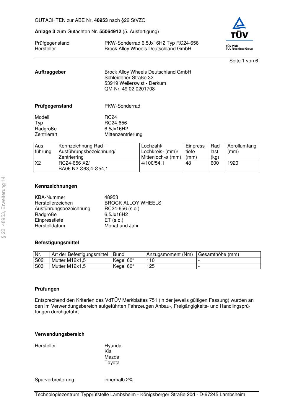 Dieses Gutachten (abe) bezieht sich auf die Alufelge Brock RC24-656 in der Ausführung 6.5Jx16 ET 0, Mittenloch 0 mm (KBA 48953). Im PDF findest du typischerweise zulässige Reifengrößen, Auflagen/Anbauhinweise und – je nach Dokument – Hinweise zur Eintragung.