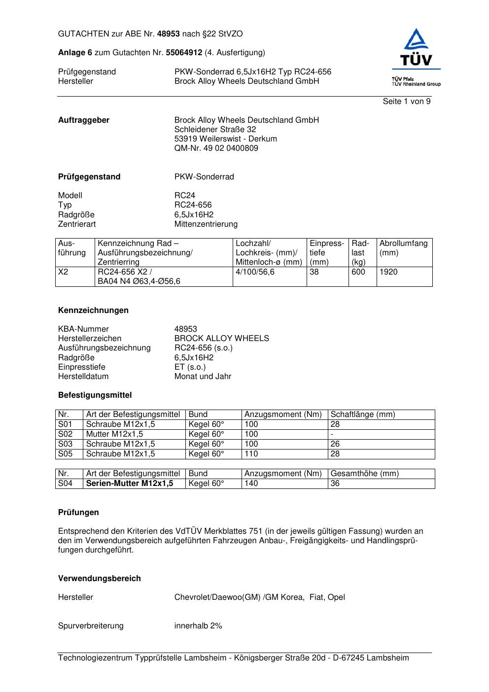 Dieses Gutachten (abe) bezieht sich auf die Alufelge Brock RC24-656 in der Ausführung 6.5Jx16 ET 0, Mittenloch 0 mm (KBA 48953). Im PDF findest du typischerweise zulässige Reifengrößen, Auflagen/Anbauhinweise und – je nach Dokument – Hinweise zur Eintragung.