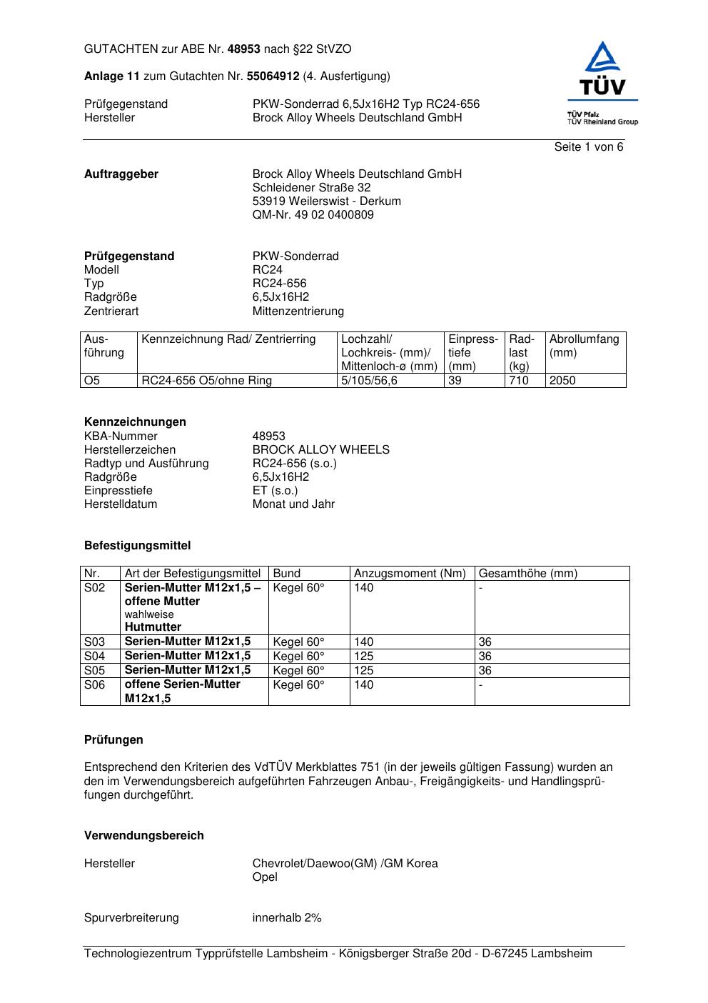 Dieses Gutachten (abe) bezieht sich auf die Alufelge Brock RC24-656 in der Ausführung 6.5Jx16 ET 0, Mittenloch 0 mm (KBA 48953). Im PDF findest du typischerweise zulässige Reifengrößen, Auflagen/Anbauhinweise und – je nach Dokument – Hinweise zur Eintragung.
