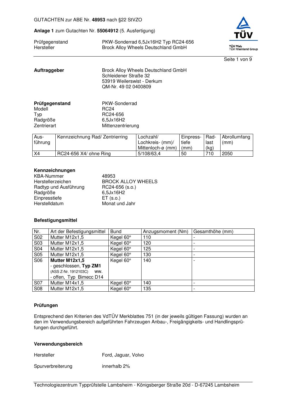 Dieses Gutachten (abe) bezieht sich auf die Alufelge Brock RC24-656 in der Ausführung 6.5Jx16 ET 0, Mittenloch 0 mm (KBA 48953). Im PDF findest du typischerweise zulässige Reifengrößen, Auflagen/Anbauhinweise und – je nach Dokument – Hinweise zur Eintragung.