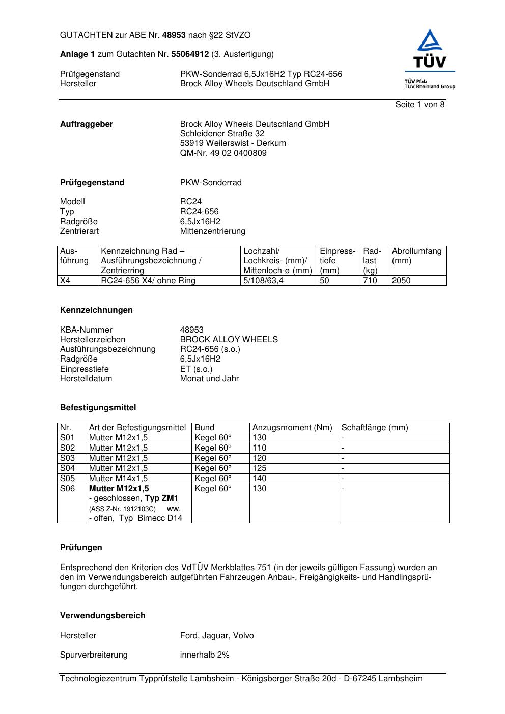 Dieses Gutachten (abe) bezieht sich auf die Alufelge Brock RC24-656 in der Ausführung 6.5Jx16 ET 0, Mittenloch 0 mm (KBA 48953). Im PDF findest du typischerweise zulässige Reifengrößen, Auflagen/Anbauhinweise und – je nach Dokument – Hinweise zur Eintragung.
