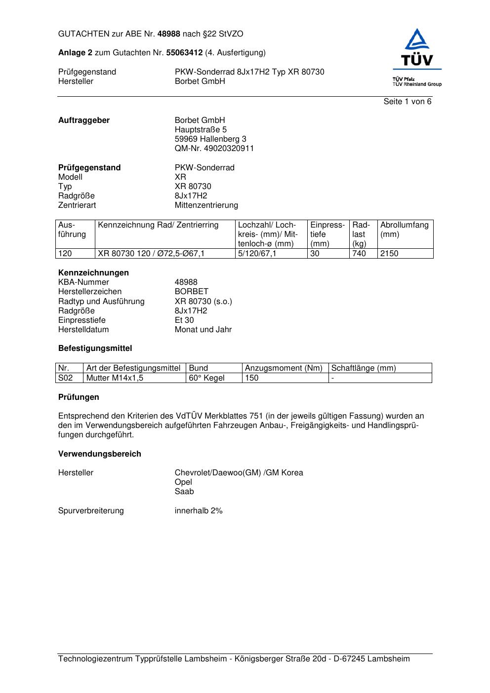 Dieses Gutachten (abe) bezieht sich auf die Alufelge Borbet XR 80730 in der Ausführung 8Jx17 ET 0, Mittenloch 0 mm (KBA 48988). Im PDF findest du typischerweise zulässige Reifengrößen, Auflagen/Anbauhinweise und – je nach Dokument – Hinweise zur Eintragung.