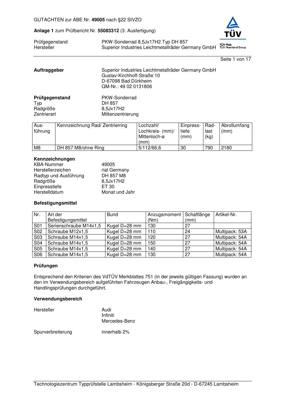 Dieses Gutachten (abe) bezieht sich auf die Alufelge brand-rial DH 857 in der Ausführung 8.5Jx17 ET 0, Mittenloch 0 mm (KBA 49005). Im PDF findest du typischerweise zulässige Reifengrößen, Auflagen/Anbauhinweise und – je nach Dokument – Hinweise zur Eintragung.