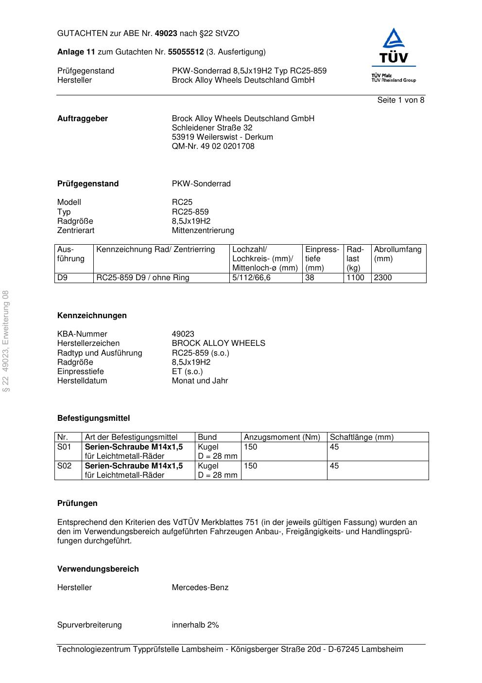 Dieses Gutachten (abe) bezieht sich auf die Alufelge Brock RC25-859 in der Ausführung 8.5Jx19 ET 0, Mittenloch 0 mm (KBA 49023). Im PDF findest du typischerweise zulässige Reifengrößen, Auflagen/Anbauhinweise und – je nach Dokument – Hinweise zur Eintragung.
