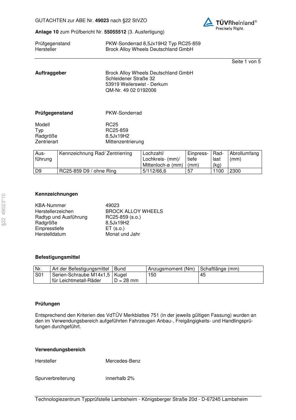 Dieses Gutachten (abe) bezieht sich auf die Alufelge Brock RC25-859 in der Ausführung 8.5Jx19 ET 0, Mittenloch 0 mm (KBA 49023). Im PDF findest du typischerweise zulässige Reifengrößen, Auflagen/Anbauhinweise und – je nach Dokument – Hinweise zur Eintragung.
