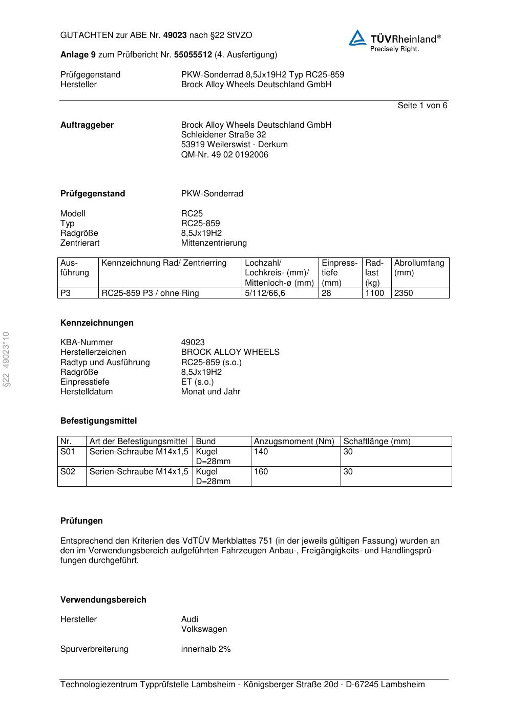 Dieses Gutachten (abe) bezieht sich auf die Alufelge Brock RC25-859 in der Ausführung 8.5Jx19 ET 0, Mittenloch 0 mm (KBA 49023). Im PDF findest du typischerweise zulässige Reifengrößen, Auflagen/Anbauhinweise und – je nach Dokument – Hinweise zur Eintragung.