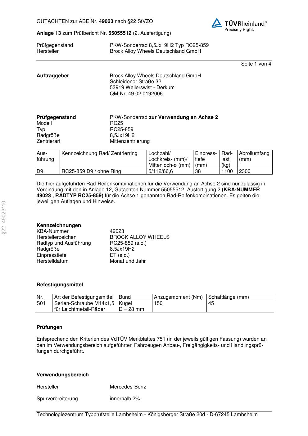 Dieses Gutachten (abe) bezieht sich auf die Alufelge Brock RC25-859 in der Ausführung 8.5Jx19 ET 0, Mittenloch 0 mm (KBA 49023). Im PDF findest du typischerweise zulässige Reifengrößen, Auflagen/Anbauhinweise und – je nach Dokument – Hinweise zur Eintragung.