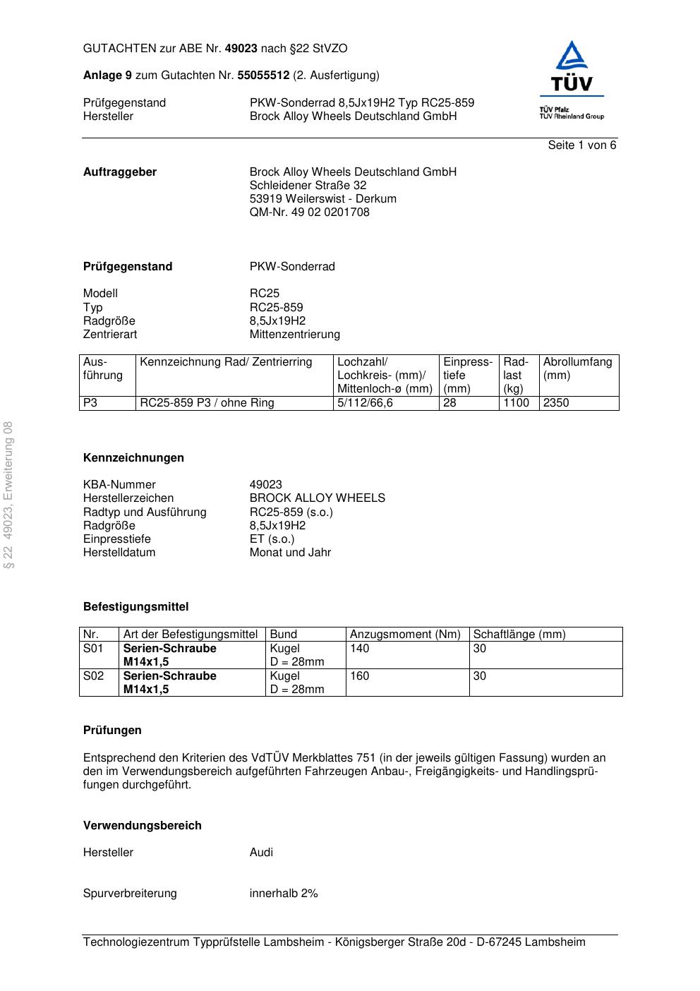 Dieses Gutachten (abe) bezieht sich auf die Alufelge Brock RC25-859 in der Ausführung 8.5Jx19 ET 0, Mittenloch 0 mm (KBA 49023). Im PDF findest du typischerweise zulässige Reifengrößen, Auflagen/Anbauhinweise und – je nach Dokument – Hinweise zur Eintragung.