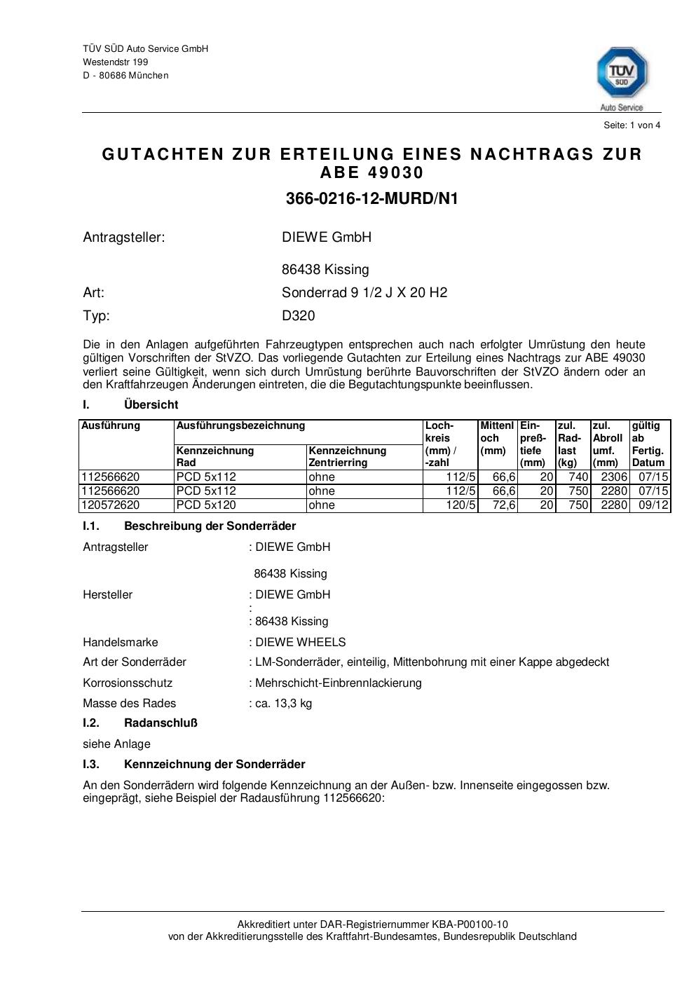 Dieses Gutachten (abe) bezieht sich auf die Alufelge Diewe D320 in der Ausführung 2Jx2 ET 0, Mittenloch 0 mm (KBA 49030). Im PDF findest du typischerweise zulässige Reifengrößen, Auflagen/Anbauhinweise und – je nach Dokument – Hinweise zur Eintragung.