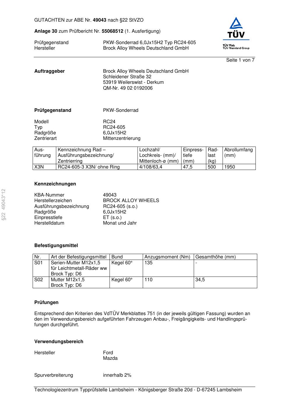 Dieses Gutachten (abe) bezieht sich auf die Alufelge Brock RC24-605 in der Ausführung 6Jx15 ET 0, Mittenloch 0 mm (KBA 49043). Im PDF findest du typischerweise zulässige Reifengrößen, Auflagen/Anbauhinweise und – je nach Dokument – Hinweise zur Eintragung.