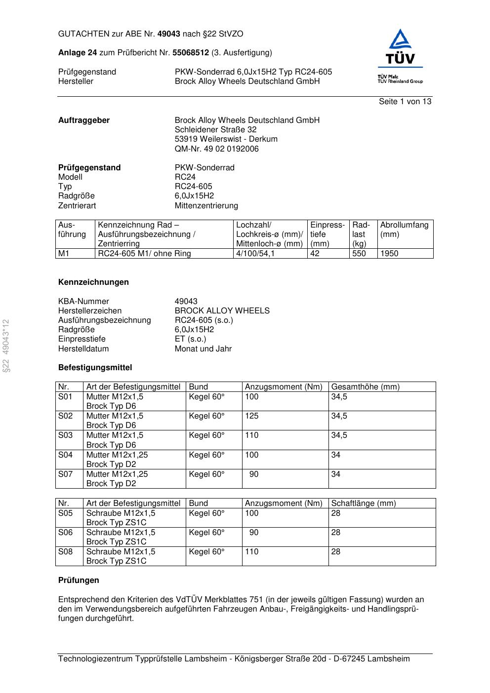 Dieses Gutachten (abe) bezieht sich auf die Alufelge Brock RC24-605 in der Ausführung 6Jx15 ET 0, Mittenloch 0 mm (KBA 49043). Im PDF findest du typischerweise zulässige Reifengrößen, Auflagen/Anbauhinweise und – je nach Dokument – Hinweise zur Eintragung.