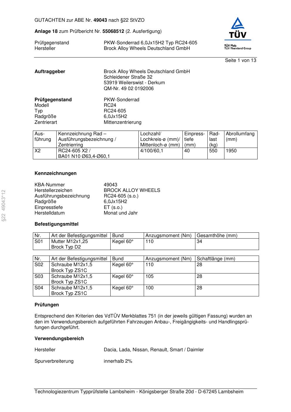 Felgengutachten / abe für Alufelgen Brock RC24-605 (6Jx15 ET 0, Mittenloch 0 mm) mit KBA 49043 (Zertifikatsnummer 49043). Hier kostenlos als PDF herunterladen. Der Download-Link ist 24 Stunden gültig und kann bis zu zwei Mal verwendet werden.