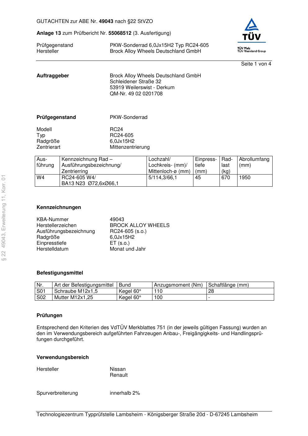 Felgengutachten / abe für Alufelgen Brock RC24-605 (6Jx15 ET 0, Mittenloch 0 mm) mit KBA 49043 (Zertifikatsnummer 49043). Hier kostenlos als PDF herunterladen. Der Download-Link ist 24 Stunden gültig und kann bis zu zwei Mal verwendet werden.