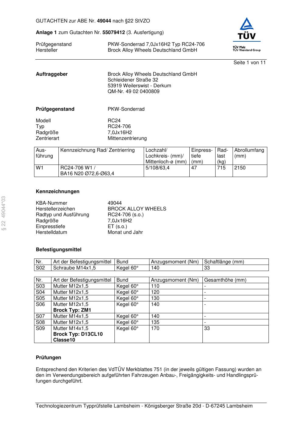 Dieses Gutachten (abe) bezieht sich auf die Alufelge Brock RC24-706 in der Ausführung 7Jx16 ET 0, Mittenloch 0 mm (KBA 49044). Im PDF findest du typischerweise zulässige Reifengrößen, Auflagen/Anbauhinweise und – je nach Dokument – Hinweise zur Eintragung.
