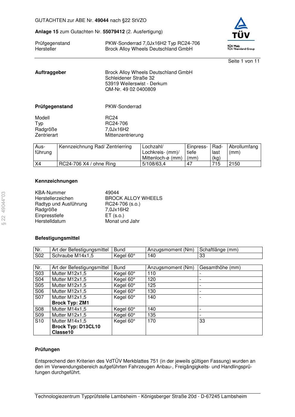 Dieses Gutachten (abe) bezieht sich auf die Alufelge Brock RC24-706 in der Ausführung 7Jx16 ET 0, Mittenloch 0 mm (KBA 49044). Im PDF findest du typischerweise zulässige Reifengrößen, Auflagen/Anbauhinweise und – je nach Dokument – Hinweise zur Eintragung.
