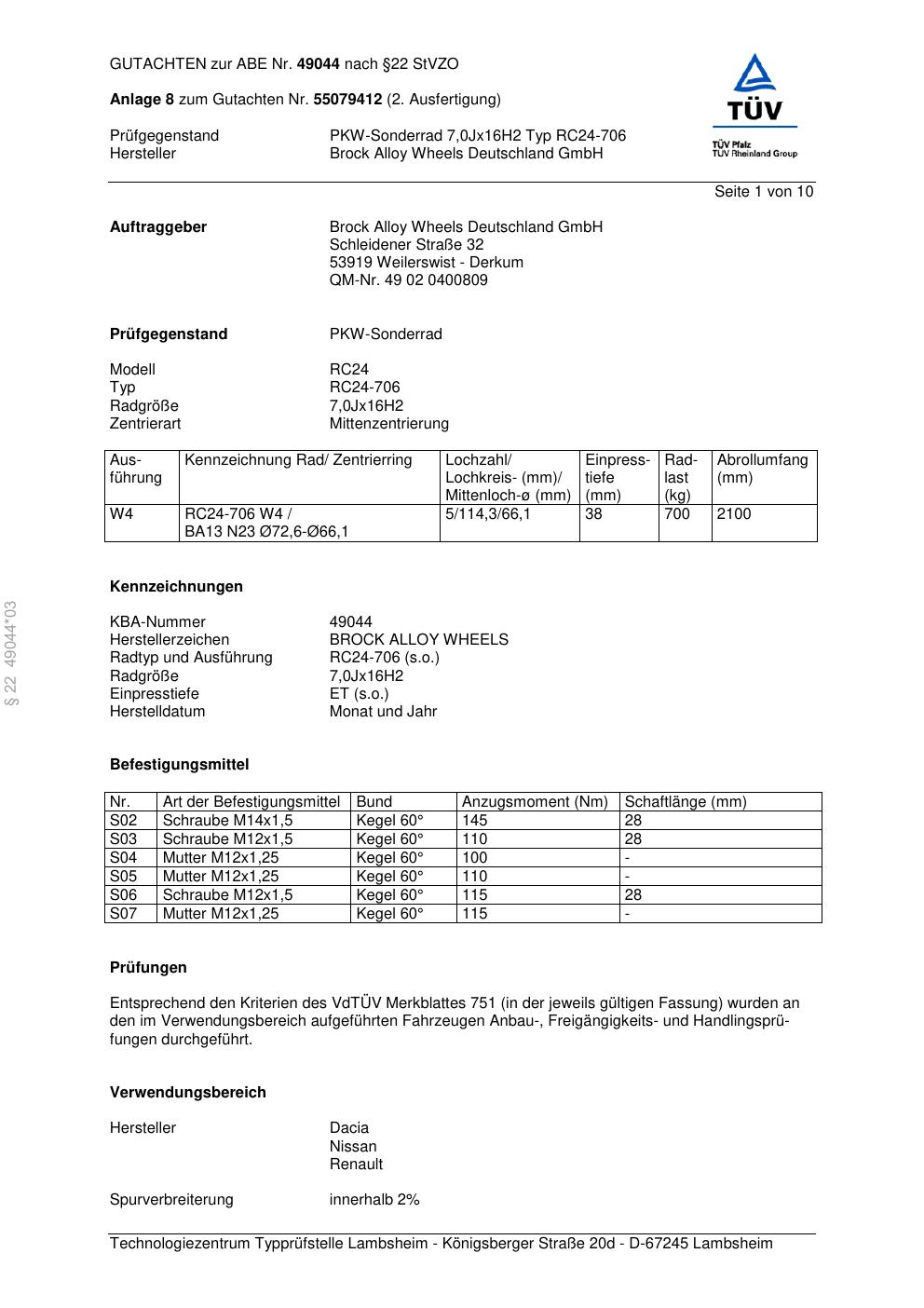 Dieses Gutachten (abe) bezieht sich auf die Alufelge Brock RC24-706 in der Ausführung 7Jx16 ET 0, Mittenloch 0 mm (KBA 49044). Im PDF findest du typischerweise zulässige Reifengrößen, Auflagen/Anbauhinweise und – je nach Dokument – Hinweise zur Eintragung.
