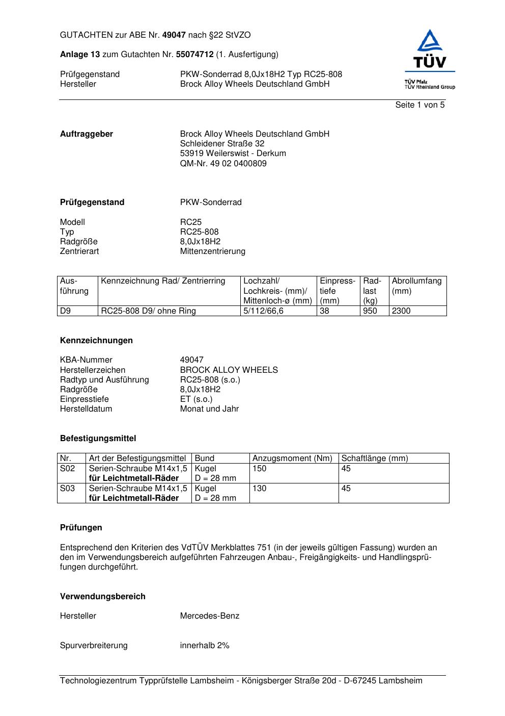 Dieses Gutachten (abe) bezieht sich auf die Alufelge Brock RC25-808 in der Ausführung 8Jx18 ET 0, Mittenloch 0 mm (KBA 49047). Im PDF findest du typischerweise zulässige Reifengrößen, Auflagen/Anbauhinweise und – je nach Dokument – Hinweise zur Eintragung.