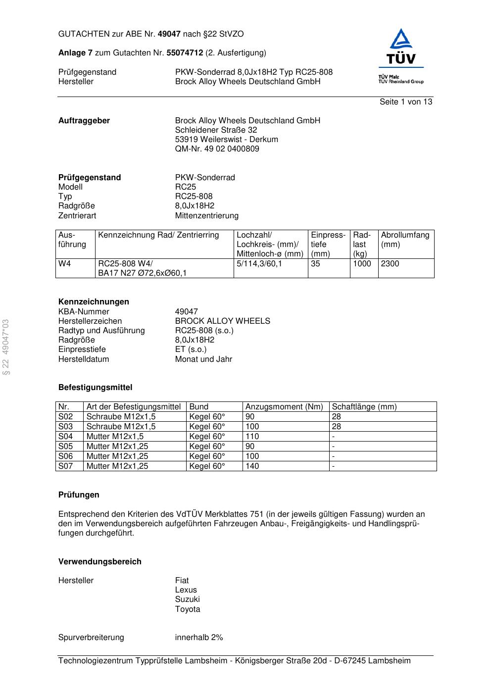 Dieses Gutachten (abe) bezieht sich auf die Alufelge Brock RC25-808 in der Ausführung 8Jx18 ET 0, Mittenloch 0 mm (KBA 49047). Im PDF findest du typischerweise zulässige Reifengrößen, Auflagen/Anbauhinweise und – je nach Dokument – Hinweise zur Eintragung.