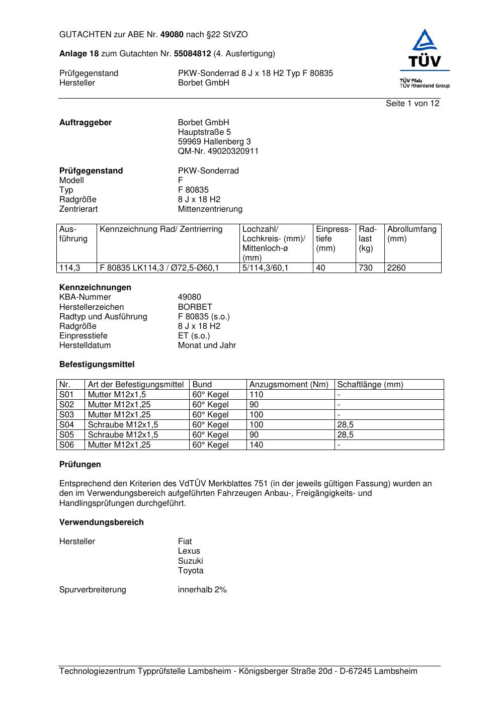 Dieses Gutachten (abe) bezieht sich auf die Alufelge Borbet F 8083 5 in der Ausführung 8Jx18 ET 0, Mittenloch 0 mm (KBA 49080). Im PDF findest du typischerweise zulässige Reifengrößen, Auflagen/Anbauhinweise und – je nach Dokument – Hinweise zur Eintragung.