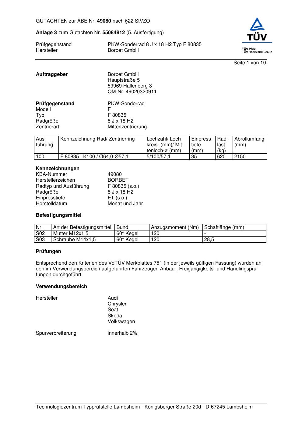 Dieses Gutachten (abe) bezieht sich auf die Alufelge Borbet F 8083 5 in der Ausführung 8Jx18 ET 0, Mittenloch 0 mm (KBA 49080). Im PDF findest du typischerweise zulässige Reifengrößen, Auflagen/Anbauhinweise und – je nach Dokument – Hinweise zur Eintragung.