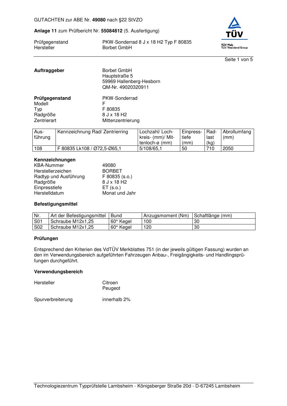 Dieses Gutachten (abe) bezieht sich auf die Alufelge Borbet F 8083 5 in der Ausführung 8Jx18 ET 0, Mittenloch 0 mm (KBA 49080). Im PDF findest du typischerweise zulässige Reifengrößen, Auflagen/Anbauhinweise und – je nach Dokument – Hinweise zur Eintragung.