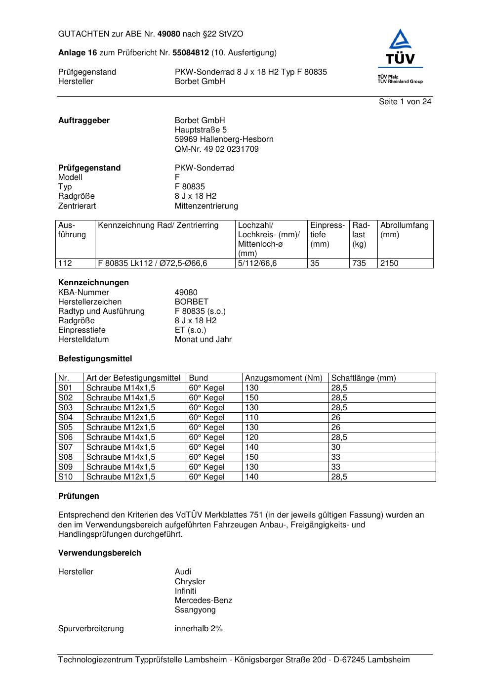 Felgengutachten / abe für Alufelgen Borbet F 8083 5 (8Jx18 ET 0, Mittenloch 0 mm) mit KBA 49080 (Zertifikatsnummer 49080). Hier kostenlos als PDF herunterladen. Der Download-Link ist 24 Stunden gültig und kann bis zu zwei Mal verwendet werden.
