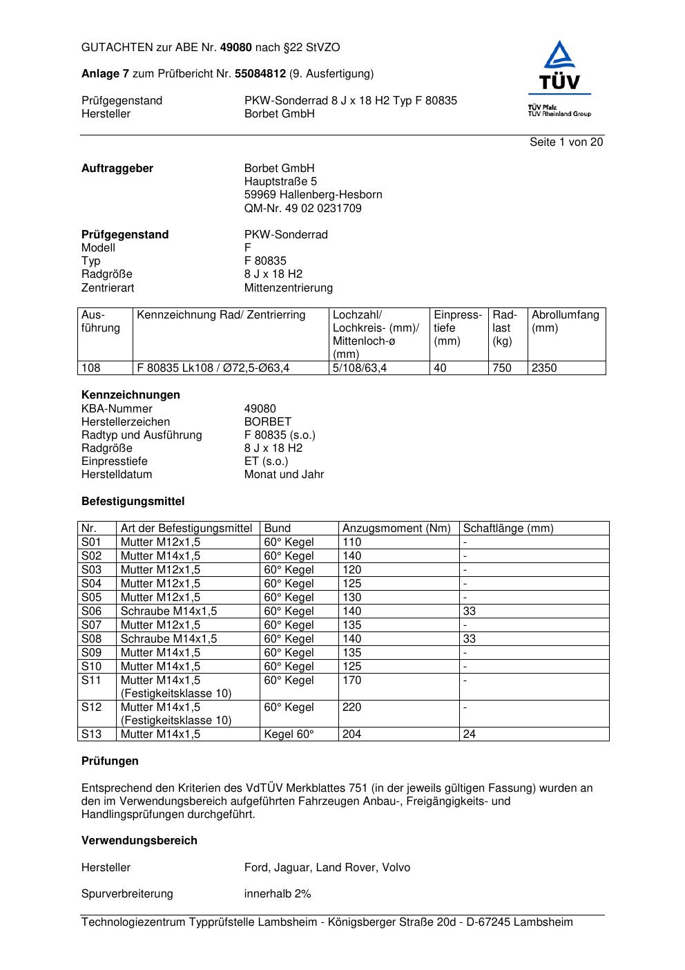 Dieses Gutachten (abe) bezieht sich auf die Alufelge Borbet F 8083 5 in der Ausführung 8Jx18 ET 0, Mittenloch 0 mm (KBA 49080). Im PDF findest du typischerweise zulässige Reifengrößen, Auflagen/Anbauhinweise und – je nach Dokument – Hinweise zur Eintragung.