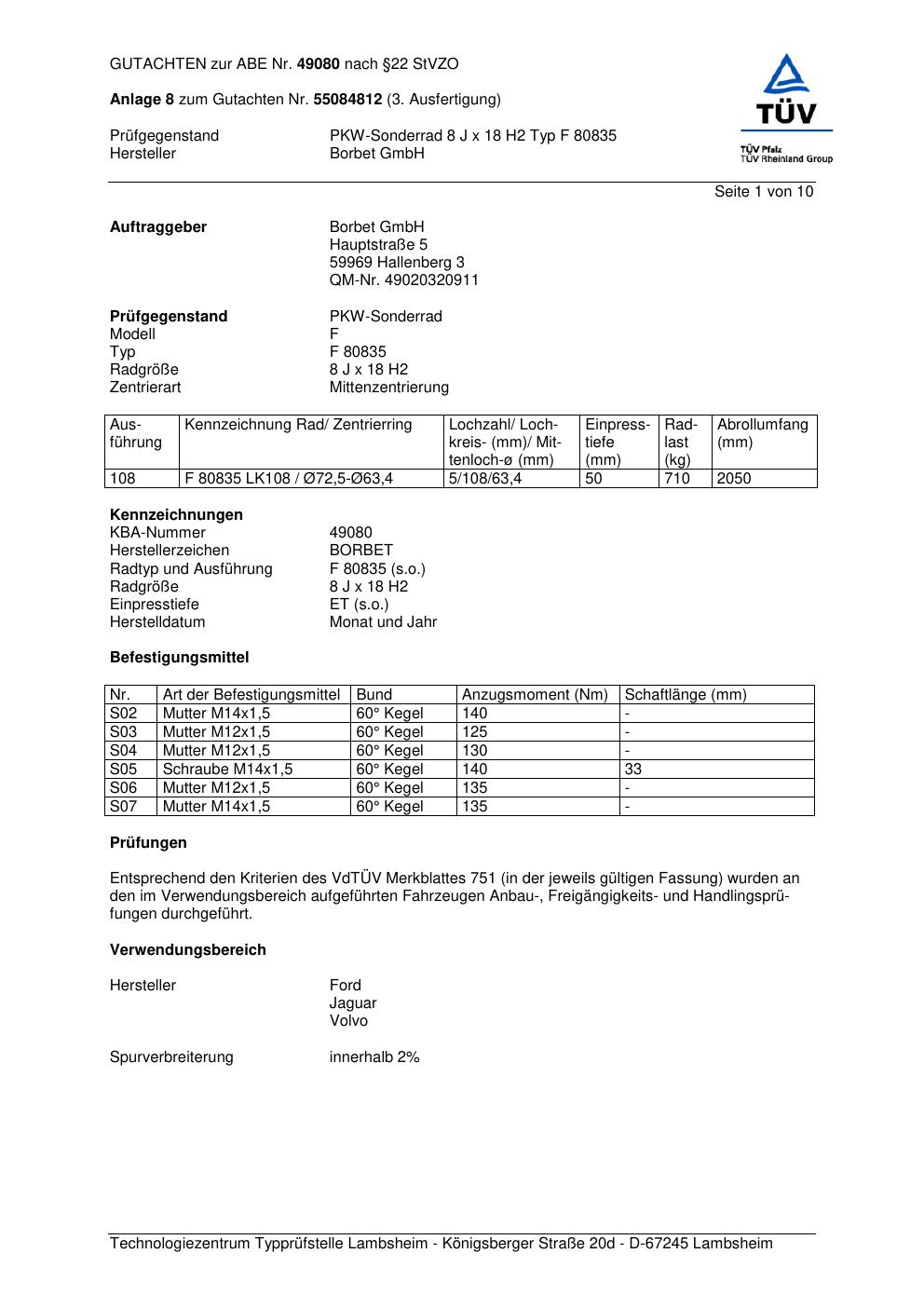 Dieses Gutachten (abe) bezieht sich auf die Alufelge Borbet F 8083 5 in der Ausführung 8Jx18 ET 0, Mittenloch 0 mm (KBA 49080). Im PDF findest du typischerweise zulässige Reifengrößen, Auflagen/Anbauhinweise und – je nach Dokument – Hinweise zur Eintragung.