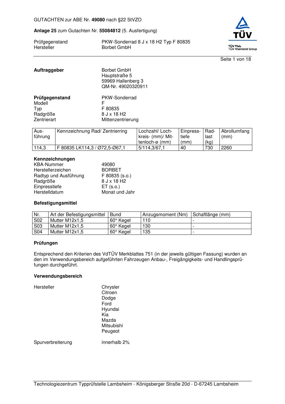 Dieses Gutachten (abe) bezieht sich auf die Alufelge Borbet F 8083 5 in der Ausführung 8Jx18 ET 0, Mittenloch 0 mm (KBA 49080). Im PDF findest du typischerweise zulässige Reifengrößen, Auflagen/Anbauhinweise und – je nach Dokument – Hinweise zur Eintragung.