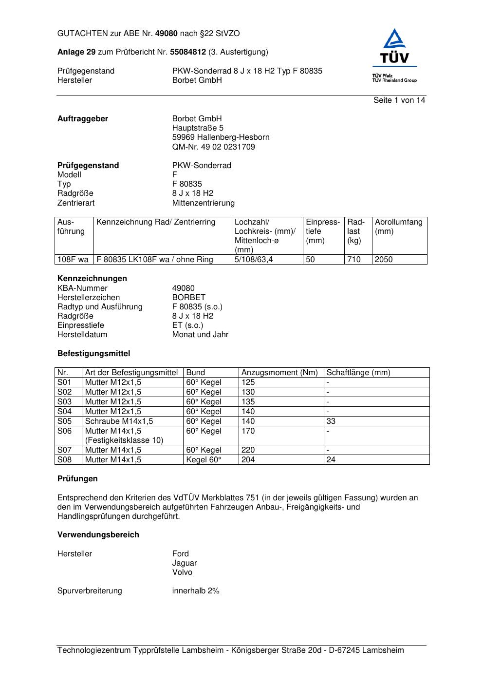 Dieses Gutachten (abe) bezieht sich auf die Alufelge Borbet F 8083 5 in der Ausführung 8Jx18 ET 0, Mittenloch 0 mm (KBA 49080). Im PDF findest du typischerweise zulässige Reifengrößen, Auflagen/Anbauhinweise und – je nach Dokument – Hinweise zur Eintragung.