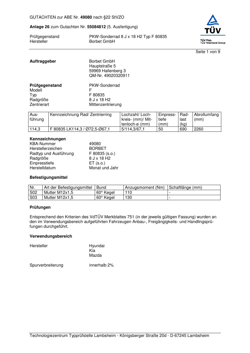 Dieses Gutachten (abe) bezieht sich auf die Alufelge Borbet F 8083 5 in der Ausführung 8Jx18 ET 0, Mittenloch 0 mm (KBA 49080). Im PDF findest du typischerweise zulässige Reifengrößen, Auflagen/Anbauhinweise und – je nach Dokument – Hinweise zur Eintragung.