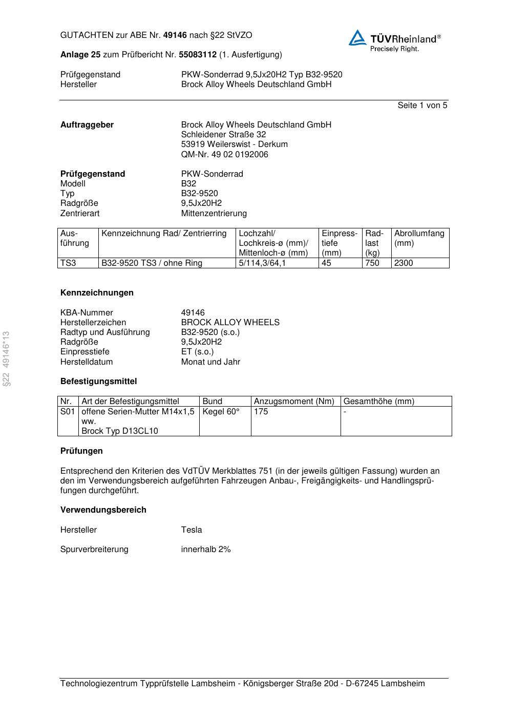 Felgengutachten / abe für Alufelgen Brock B32-9520 (9.5Jx2 ET 0, Mittenloch 0 mm) mit KBA 49146 (Zertifikatsnummer 49146). Hier kostenlos als PDF herunterladen. Der Download-Link ist 24 Stunden gültig und kann bis zu zwei Mal verwendet werden.