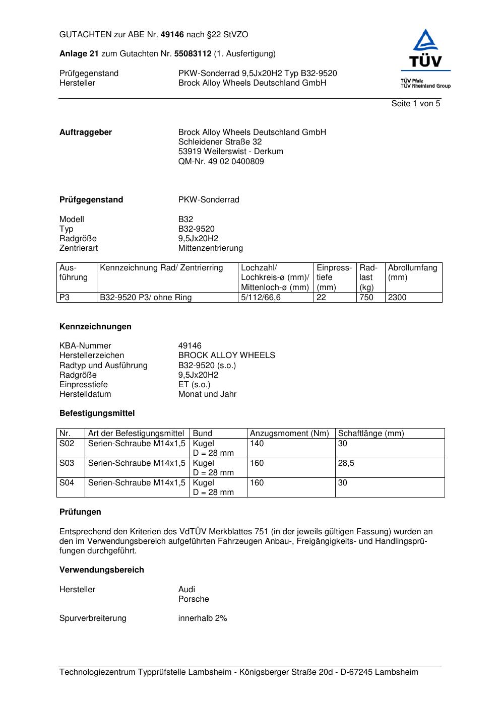 Dieses Gutachten (abe) bezieht sich auf die Alufelge Brock B32-9520 in der Ausführung 9.5Jx2 ET 0, Mittenloch 0 mm (KBA 49146). Im PDF findest du typischerweise zulässige Reifengrößen, Auflagen/Anbauhinweise und – je nach Dokument – Hinweise zur Eintragung.