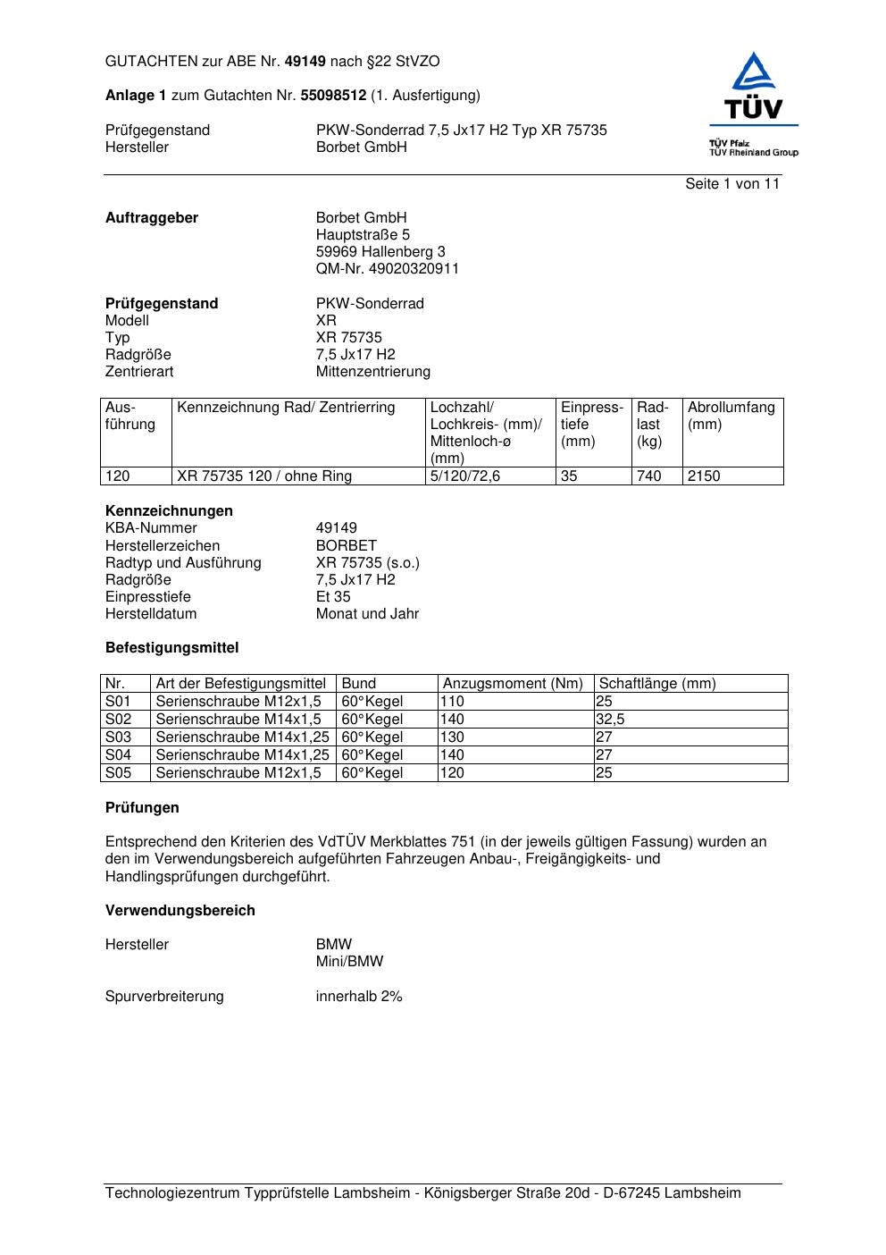 Dieses Gutachten (abe) bezieht sich auf die Alufelge Borbet XR 757 35 in der Ausführung 7.5Jx17 ET 0, Mittenloch 0 mm (KBA 49149). Im PDF findest du typischerweise zulässige Reifengrößen, Auflagen/Anbauhinweise und – je nach Dokument – Hinweise zur Eintragung.