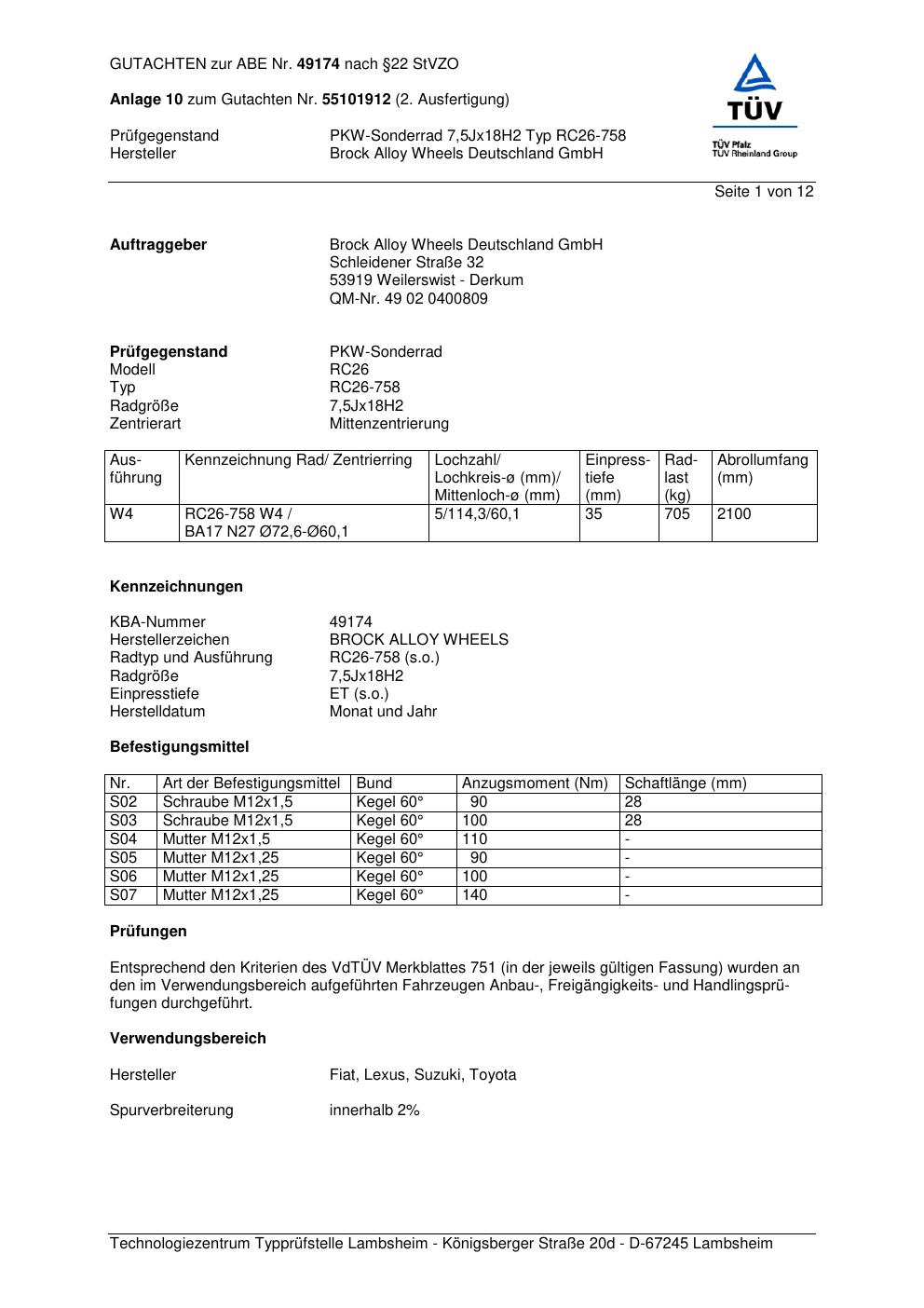 Dieses Gutachten (abe) bezieht sich auf die Alufelge Brock RC26-758 in der Ausführung 7.5Jx18 ET 0, Mittenloch 0 mm (KBA 49174). Im PDF findest du typischerweise zulässige Reifengrößen, Auflagen/Anbauhinweise und – je nach Dokument – Hinweise zur Eintragung.