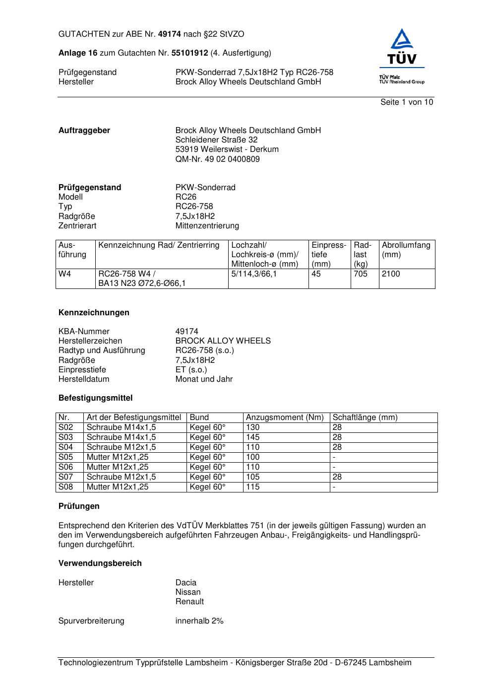 Dieses Gutachten (abe) bezieht sich auf die Alufelge Brock RC26-758 in der Ausführung 7.5Jx18 ET 0, Mittenloch 0 mm (KBA 49174). Im PDF findest du typischerweise zulässige Reifengrößen, Auflagen/Anbauhinweise und – je nach Dokument – Hinweise zur Eintragung.