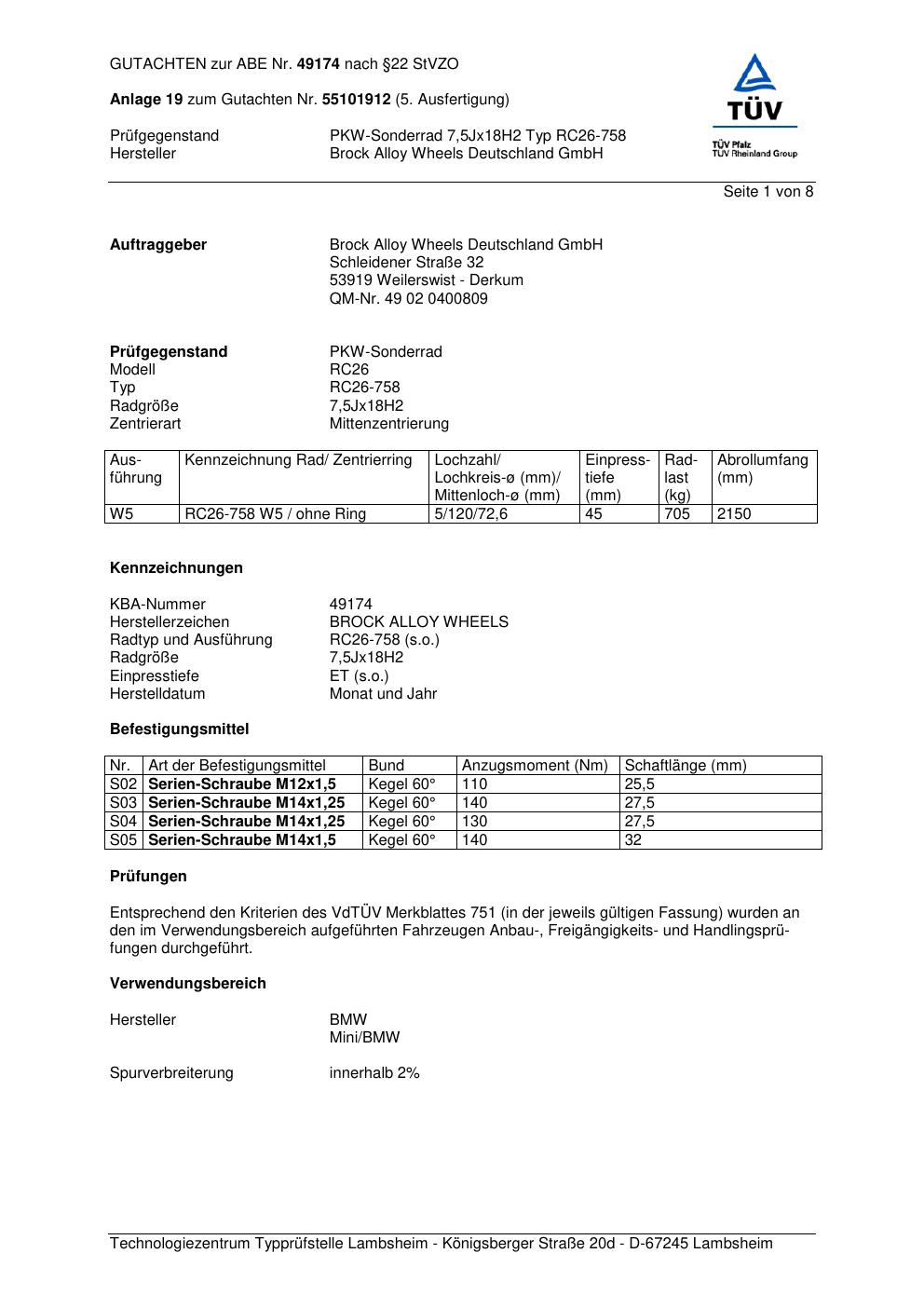 Dieses Gutachten (abe) bezieht sich auf die Alufelge Brock RC26-758 in der Ausführung 7.5Jx18 ET 0, Mittenloch 0 mm (KBA 49174). Im PDF findest du typischerweise zulässige Reifengrößen, Auflagen/Anbauhinweise und – je nach Dokument – Hinweise zur Eintragung.