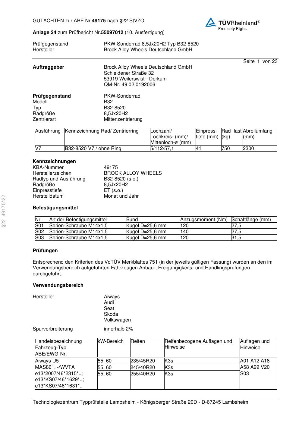 Dieses Gutachten (abe) bezieht sich auf die Alufelge Brock B32-8520 in der Ausführung 8.5Jx2 ET 0, Mittenloch 0 mm (KBA 49175). Im PDF findest du typischerweise zulässige Reifengrößen, Auflagen/Anbauhinweise und – je nach Dokument – Hinweise zur Eintragung.