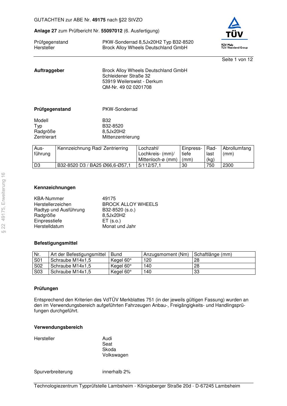 Dieses Gutachten (abe) bezieht sich auf die Alufelge Brock B32-8520 in der Ausführung 8.5Jx2 ET 0, Mittenloch 0 mm (KBA 49175). Im PDF findest du typischerweise zulässige Reifengrößen, Auflagen/Anbauhinweise und – je nach Dokument – Hinweise zur Eintragung.