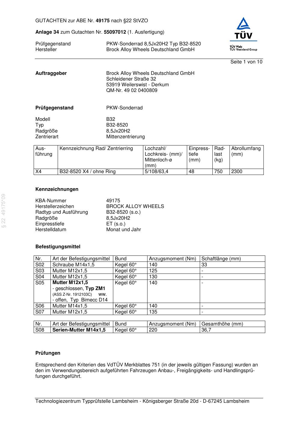 Dieses Gutachten (abe) bezieht sich auf die Alufelge Brock B32-8520 in der Ausführung 8.5Jx2 ET 0, Mittenloch 0 mm (KBA 49175). Im PDF findest du typischerweise zulässige Reifengrößen, Auflagen/Anbauhinweise und – je nach Dokument – Hinweise zur Eintragung.
