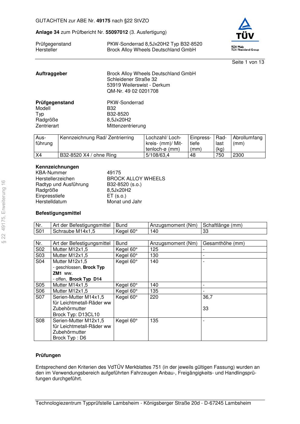 Dieses Gutachten (abe) bezieht sich auf die Alufelge Brock B32-8520 in der Ausführung 8.5Jx2 ET 0, Mittenloch 0 mm (KBA 49175). Im PDF findest du typischerweise zulässige Reifengrößen, Auflagen/Anbauhinweise und – je nach Dokument – Hinweise zur Eintragung.